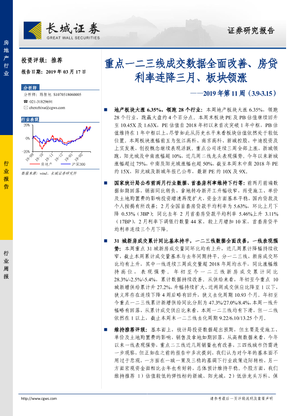 【长城证券】【20190317】房地产行业2019年第11周:重点一二三线成交数据全面改善、房贷利率连降三月、板块领涨-16页