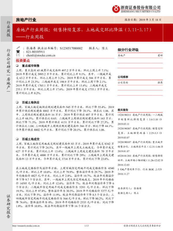 【浙商证券】【20190318】房地产行业周报:销售持续复苏,土地成交环比降温-13页