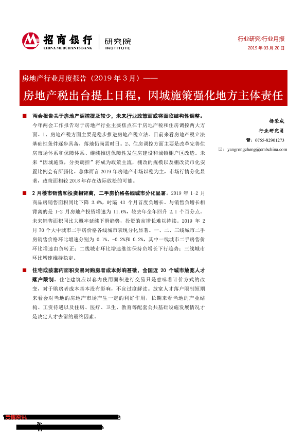 【招商银行】【201903】房地产行业月度报告:房地产税出台提上日程,因城施策强化地方主体责任-22页