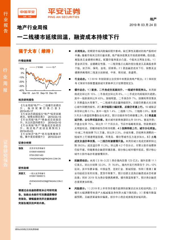 【平安证券】【20190324】地产行业周报:一二线楼市延续回温,融资成本持续下行-5页