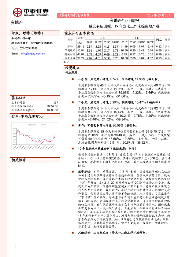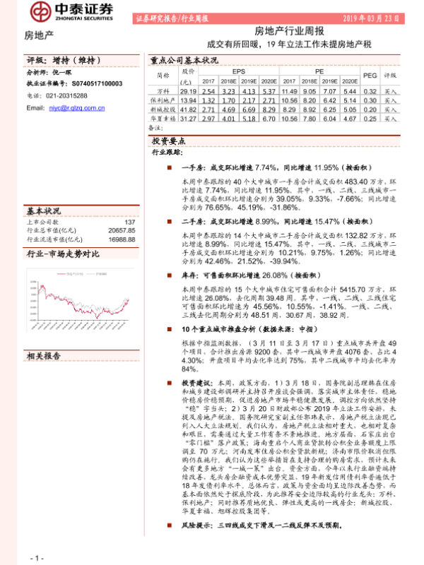 【中泰证券】【20190323】房地产行业周报:成交有所回暖,19年立法工作未提房地产税-17页