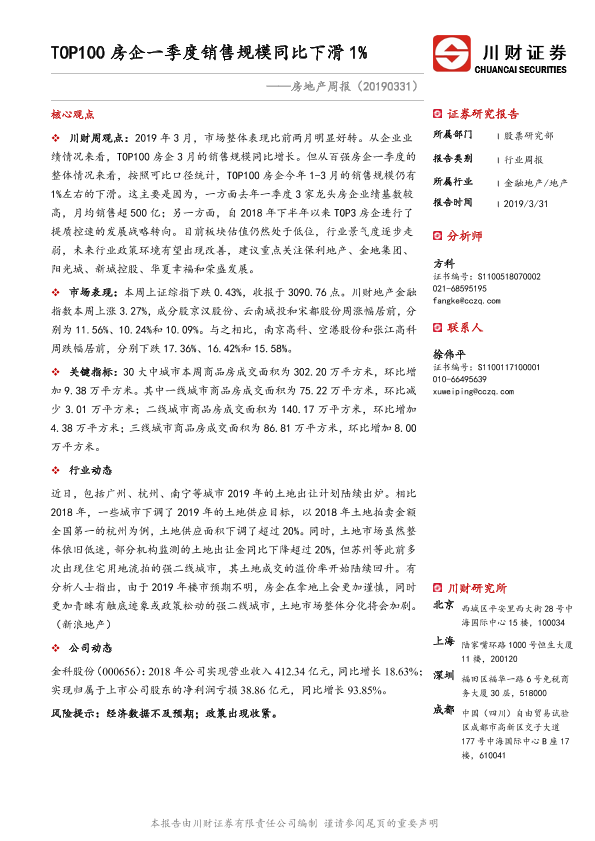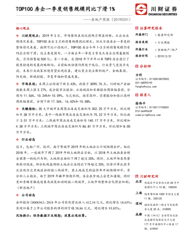 【川财证券】【20190331】TOP100房企一季度销售规模同比下滑1%-11页