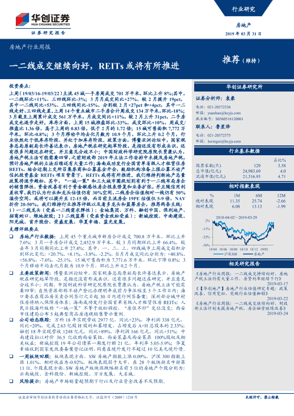 【华创证券】【20190331】房地产行业周报:一二线成交继续向好,REITs或将有所推进-24页