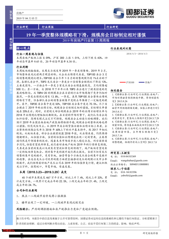 【国都证券】【20190403】2019年房地产行业第13周周报:19年一季度整体规模略有下滑,规模房企目标制定相对谨慎-18页
