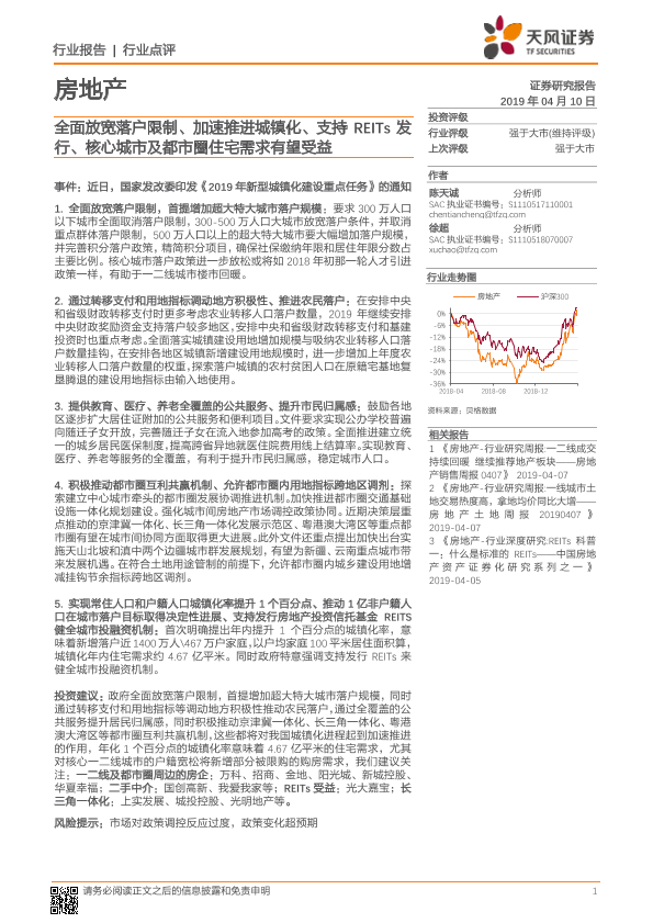 【天风证券】【20190410】房地产行业点评:全面放宽落户限制、加速推进城镇化、支持REITs发行、核心城市及都市圈住宅需求有望受益-3页