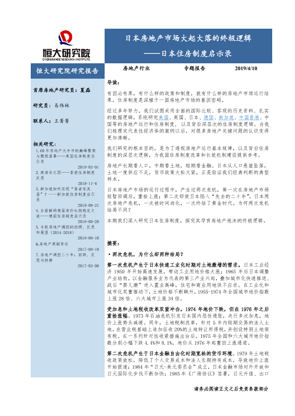 【恒大研究院】【20190410】日本住房制度启示录:日本房地产市场大起大落的终极逻辑-63页