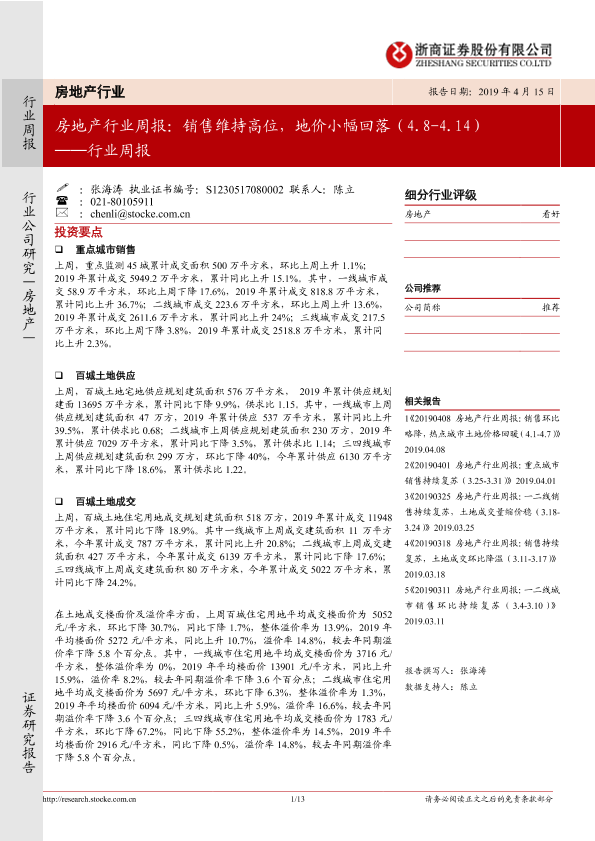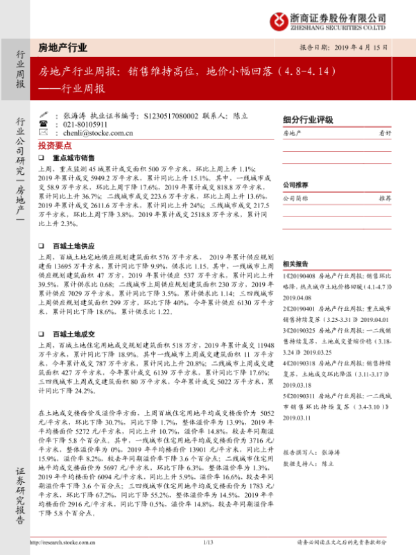 【浙商证券】【20190415】房地产行业周报:销售维持高位,地价小幅回落-13页