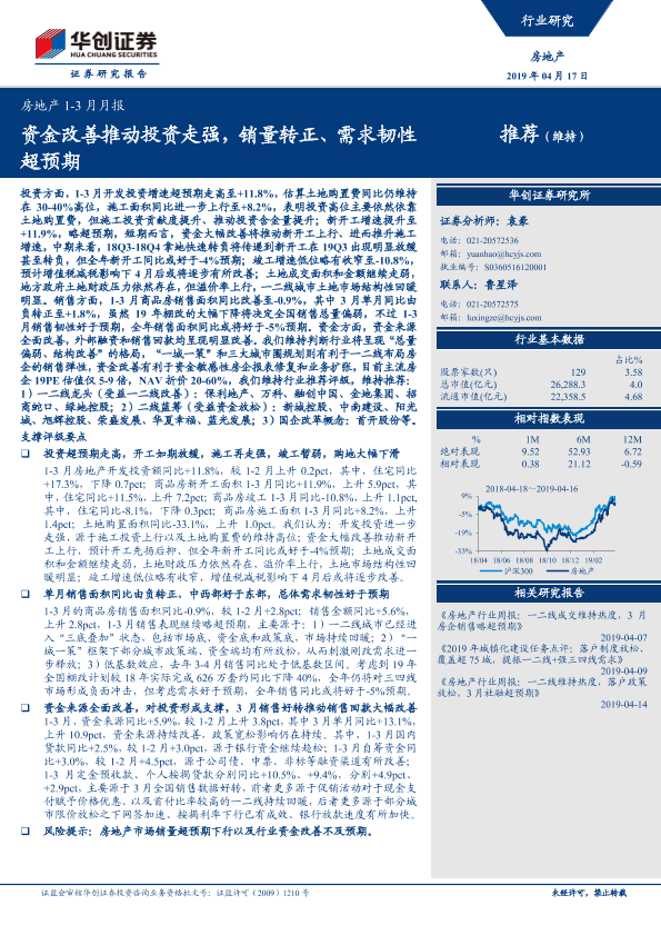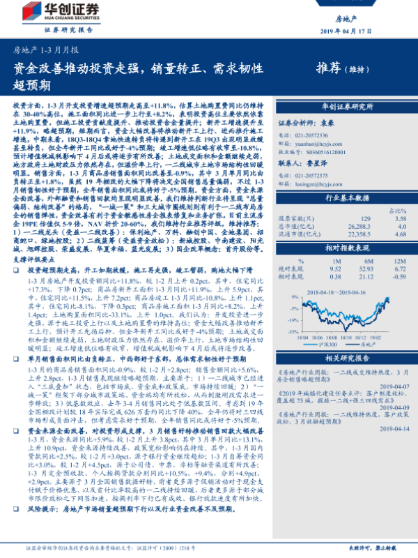 【华创证券】【20190417】房地产1-3月月报:资金改善推动投资走强,销量转正、需求韧性超预期-14页