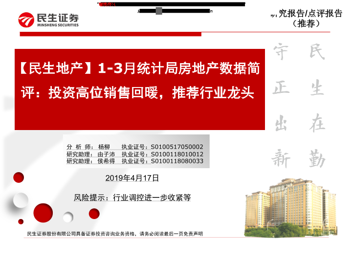 【民生证券】【20190417】1-3月统计局房地产数据简评:投资高位销售回暖,推荐行业龙头-5页