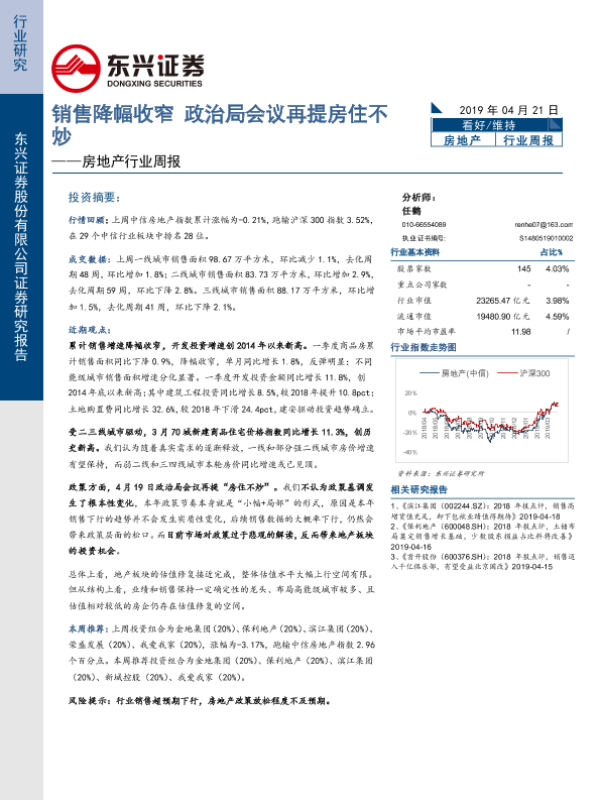 【东兴证券】【20190421】房地产行业周报:销售降幅收窄 政治局会议再提房住不炒-12页