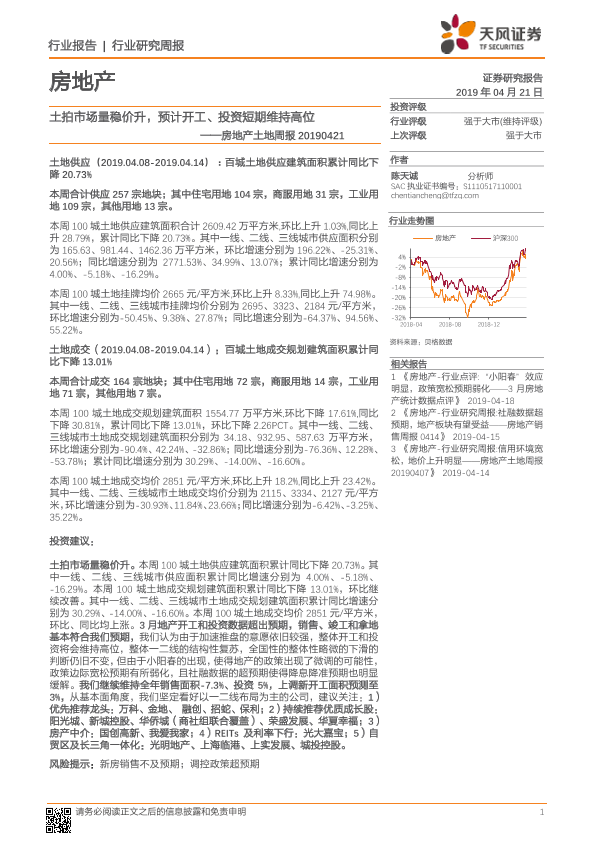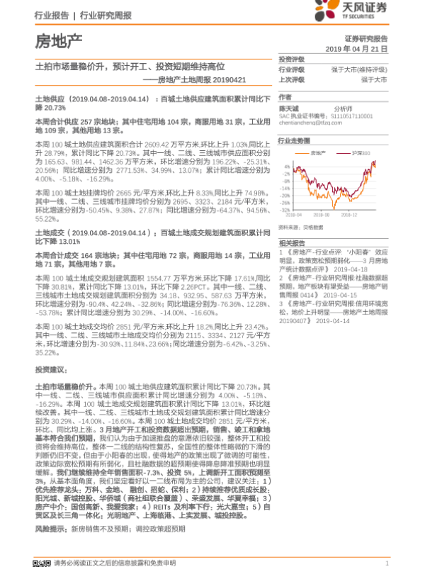 【天风证券】【20190421】土拍市场量稳价升,预计开工、投资短期维持高位-9页