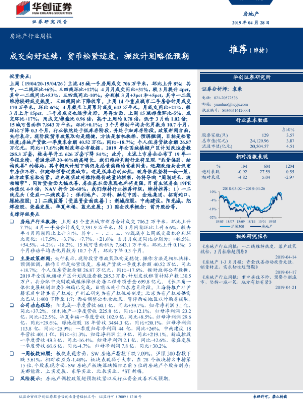 【华创证券】【20190428】房地产行业周报:成交向好延续,货币松紧适度,棚改计划略低预期-27页