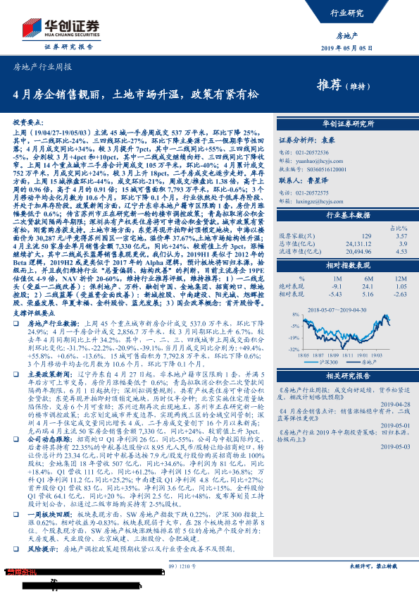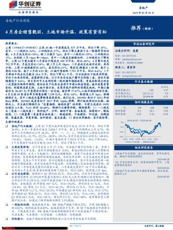 【华创证券】【20190505】4月房企销售靓丽,土地市场升温,政策有紧有松-22页