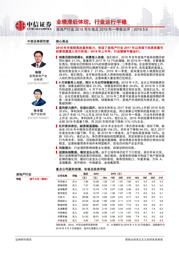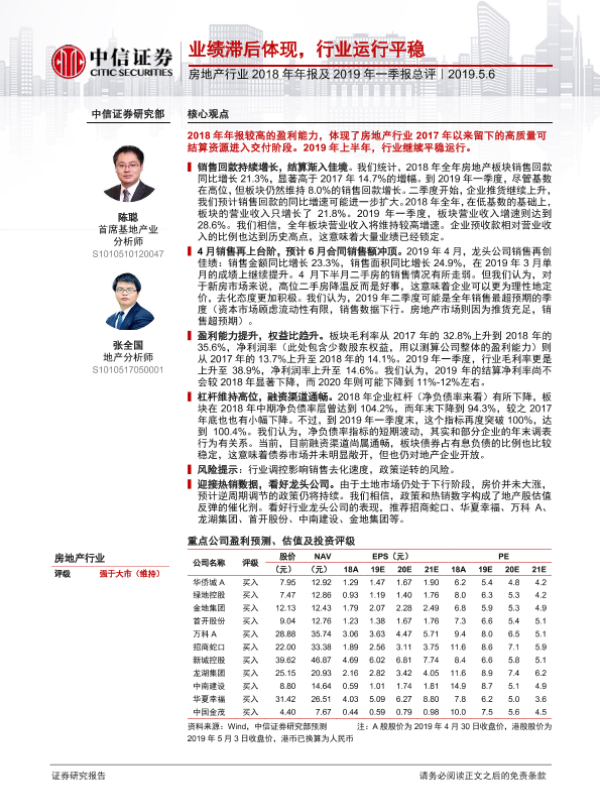 【中信证券】【20190506】房地产行业2018年年报及2019年一季报点评:业绩滞后体现,行业运行平稳-11页