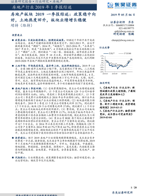 【东吴证券】【20190506】房地产板块2019一季报综述:政策稳中向好,土地热度回升,板块业绩增长稳健-20页