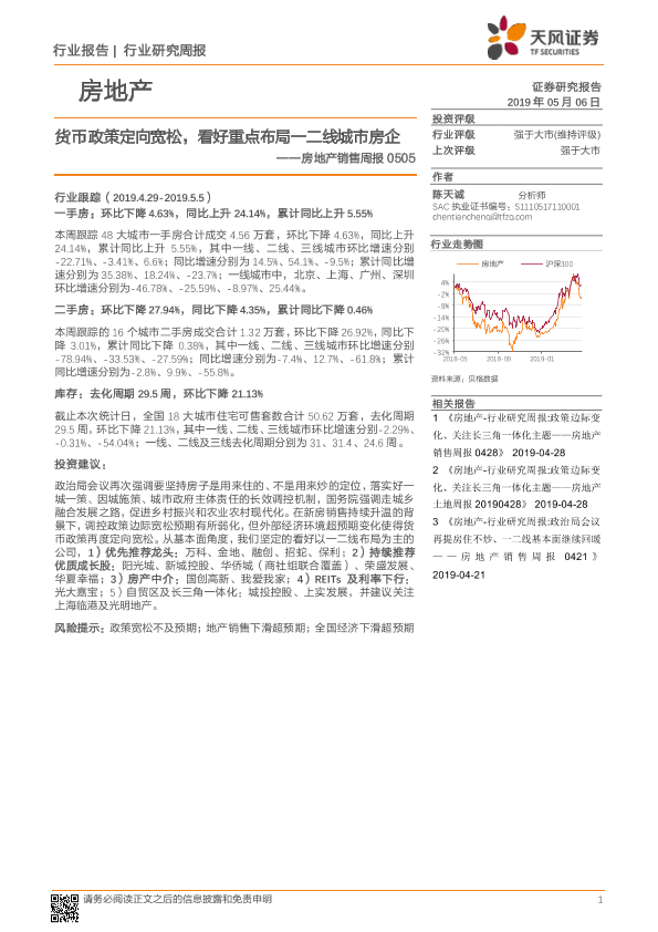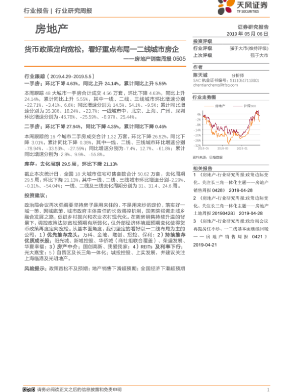 【天风证券】【20190506】房地产销售周报:货币政策定向宽松,看好重点布局一二线城市房企-14页