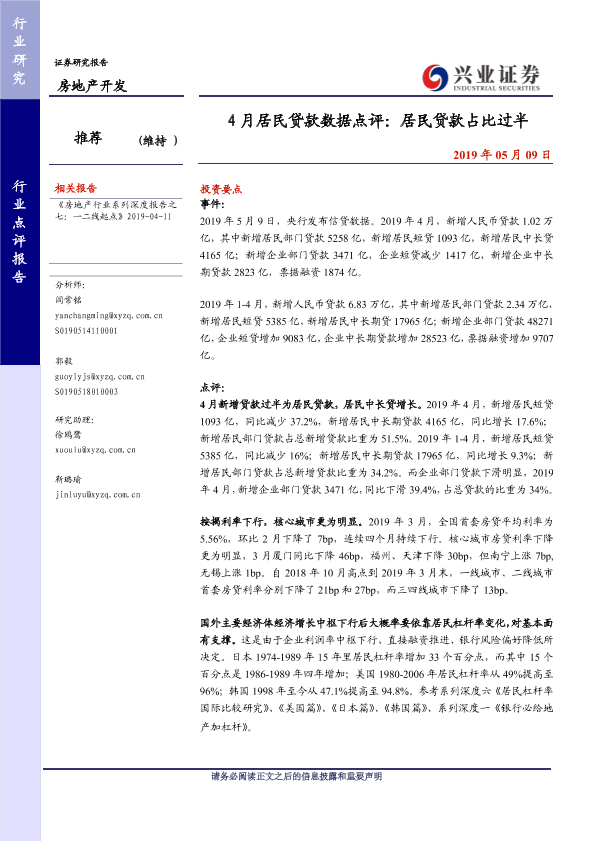 【兴业证券】【20190509】4月居民贷款数据点评:居民贷款占比过半-3页
