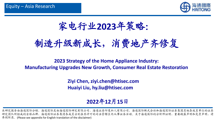 【海通国际】【20221215】家电行业2023年策略:制造升级新成长,消费地产齐修复-86页