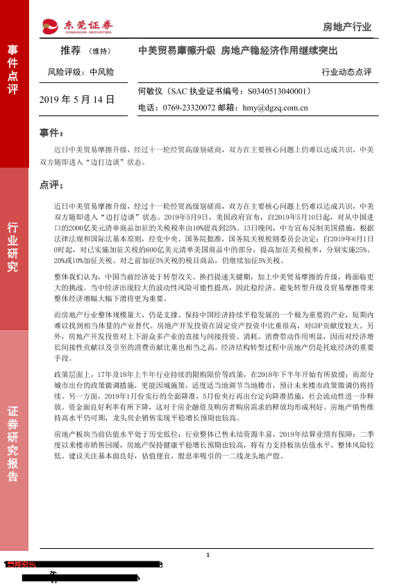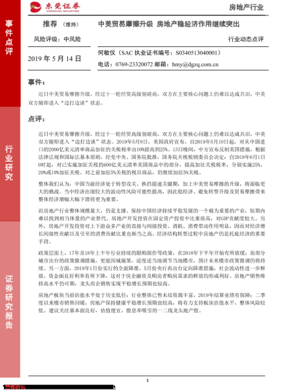 【东莞证券】【20190514】房地产行业动态点评:中美贸易摩擦升级 房地产稳经济作用继续突出-2页