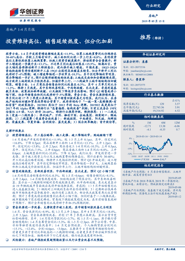 【华创证券】【20190515】房地产1-4月月报:投资维持高位,销售延续热度、但分化加剧-14页