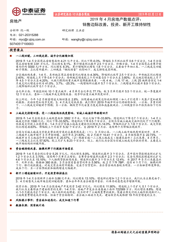 【中泰证券】【20190515】2019年4月房地产数据点评:销售边际改善,投资、新开工维持韧性-2页