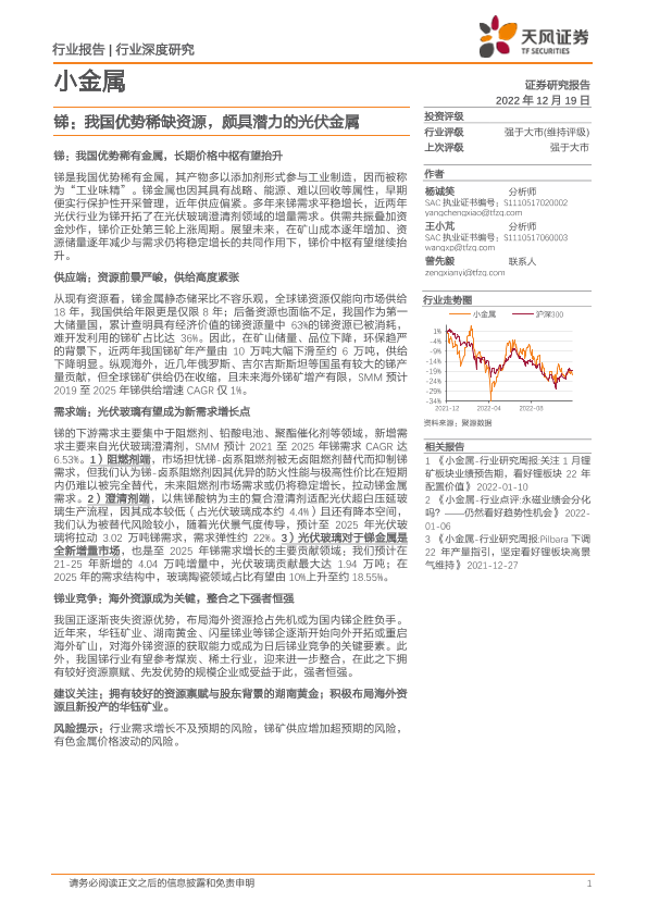 【天风证券】【20221219】小金属行业:锑,我国优势稀缺资源,颇具潜力的光伏金属-20页