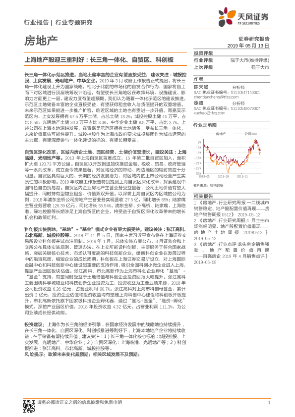【天风证券】【20190513】上海地产股迎三重利好:长三角一体化、自贸区、科创板-47页