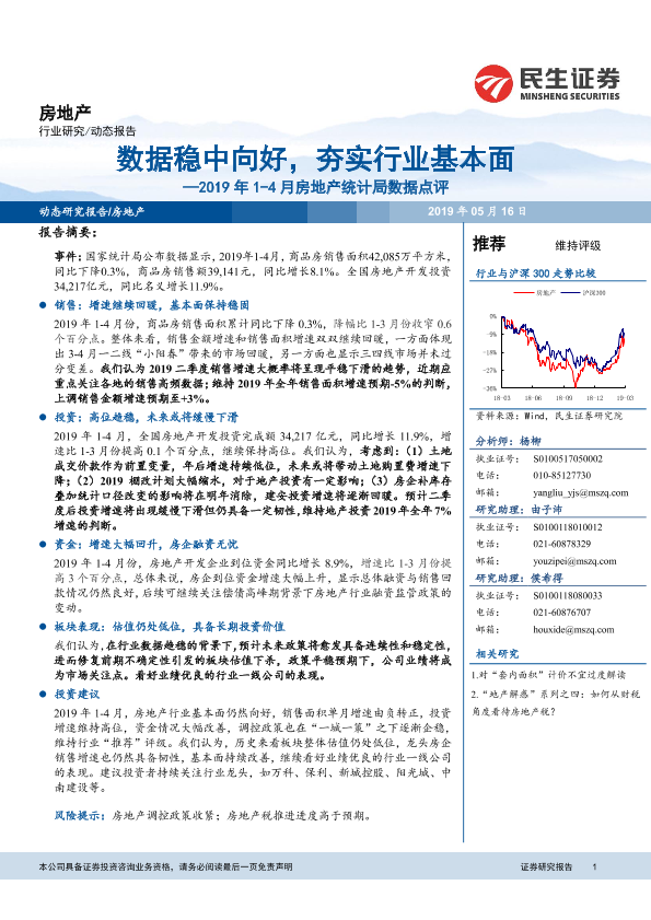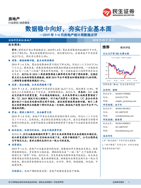 【民生证券】【20190516】2019年1-4月房地产统计局数据点评:数据稳中向好,夯实行业基本面-12页