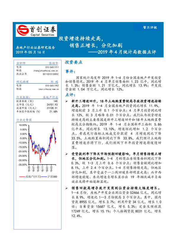 【首创证券】【20190516】2019年4月统计局数据点评:投资增速持续走高,销售正增长,分化加剧-3页