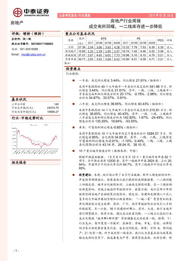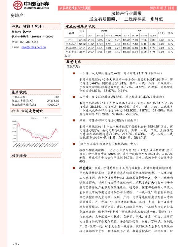 【中泰证券】【20190518】房地产行业周报:成交有所回暖,一二线库存进一步降低-18页