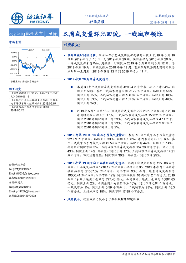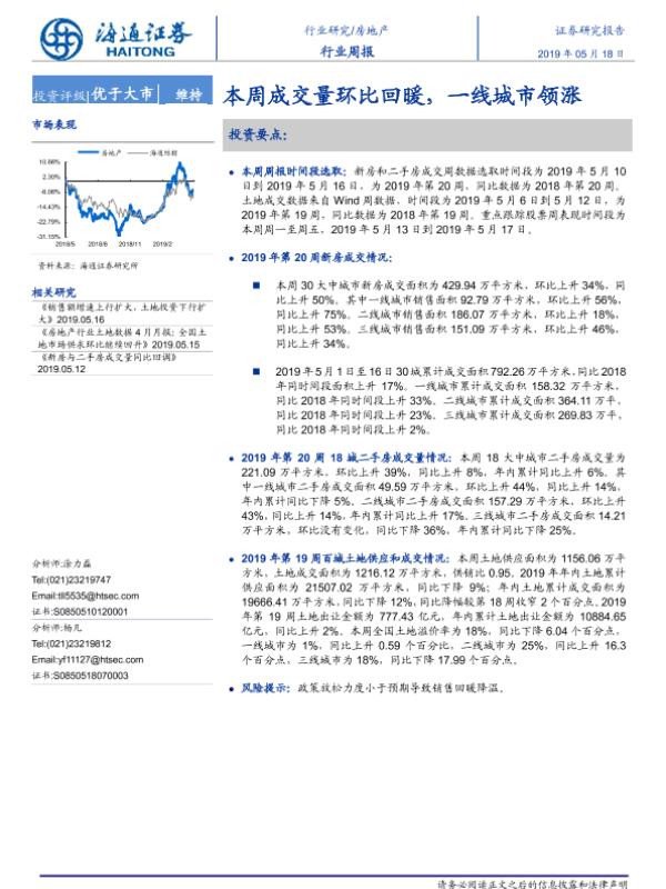 【海通证券】【20190518】房地产行业周报:本周成交量环比回暖,一线城市领涨-6页