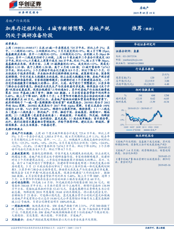 【华创证券】【20190519】房地产行业周报:加库存过程纠结,4城市新增预警,房地产税仍处于调研准备阶段-25页