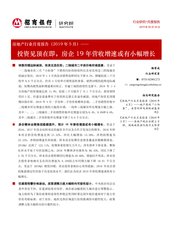 【招商银行】【20190524】房地产行业月度报告:投资见顶在即,房企19年营收增速或有小幅增长-23页
