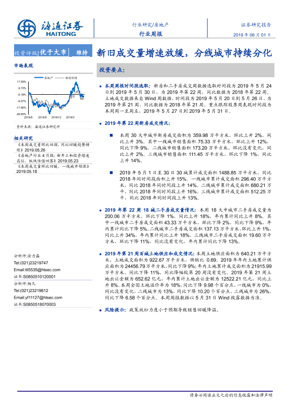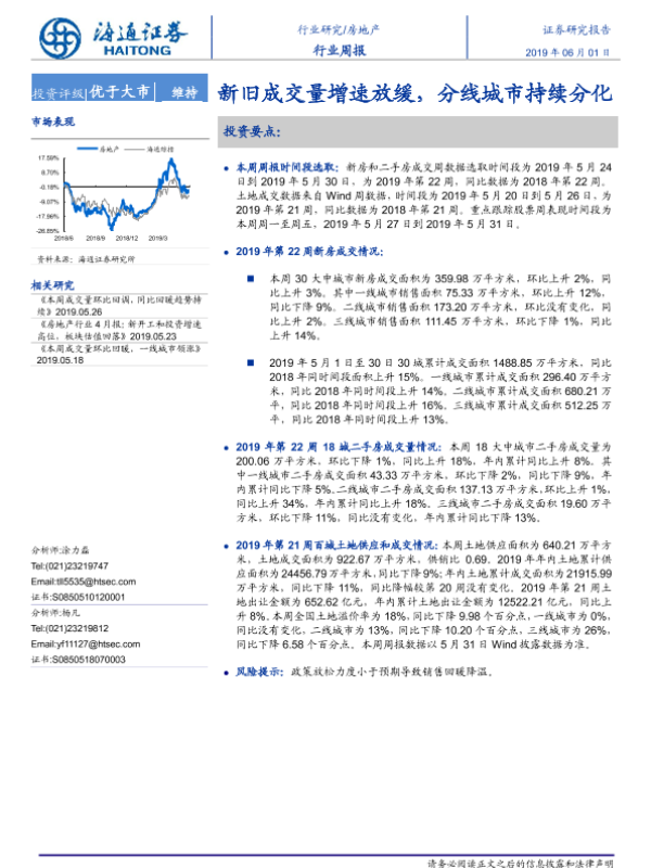 【海通证券】【20190601】房地产行业周报:新旧成交量增速放缓,分线城市持续分化-6页