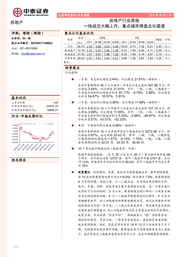 【中泰证券】【20190601】房地产行业周报:一线成交大幅上升,重点城市推盘去化提速-19页