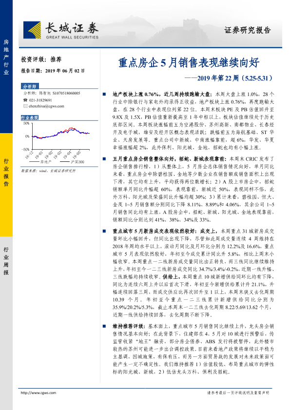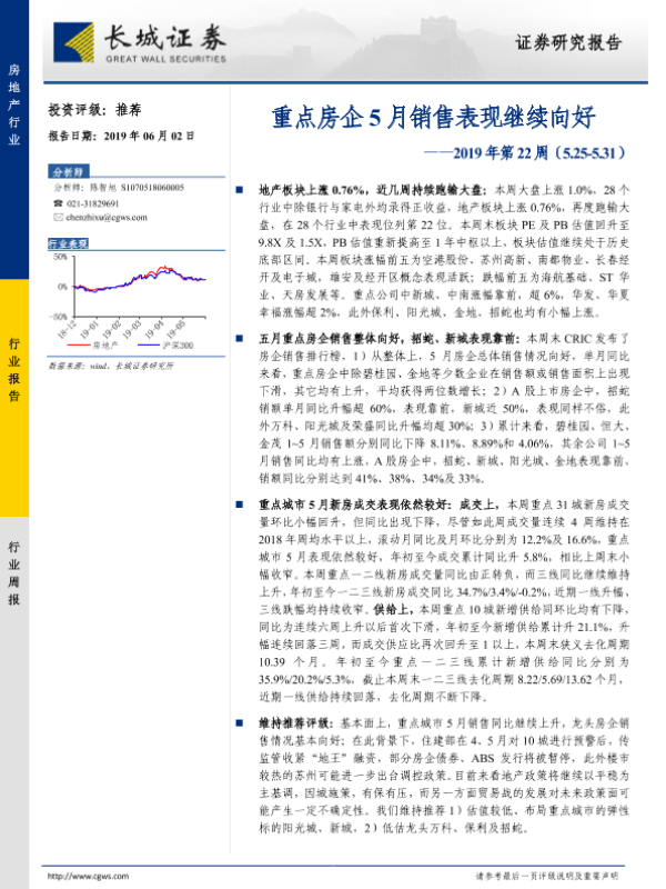 【长城证券】【20190602】房地产行业2019年第22周:重点房企5月销售表现继续向好-17页
