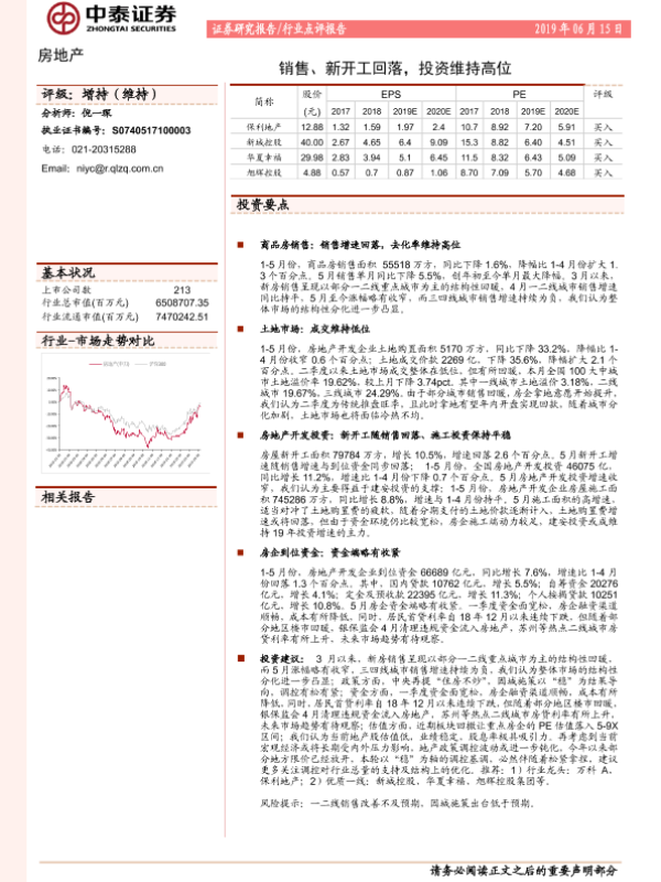 【中泰证券】【20190615】房地产行业点评报告:销售、新开工回落,投资维持高位-2页