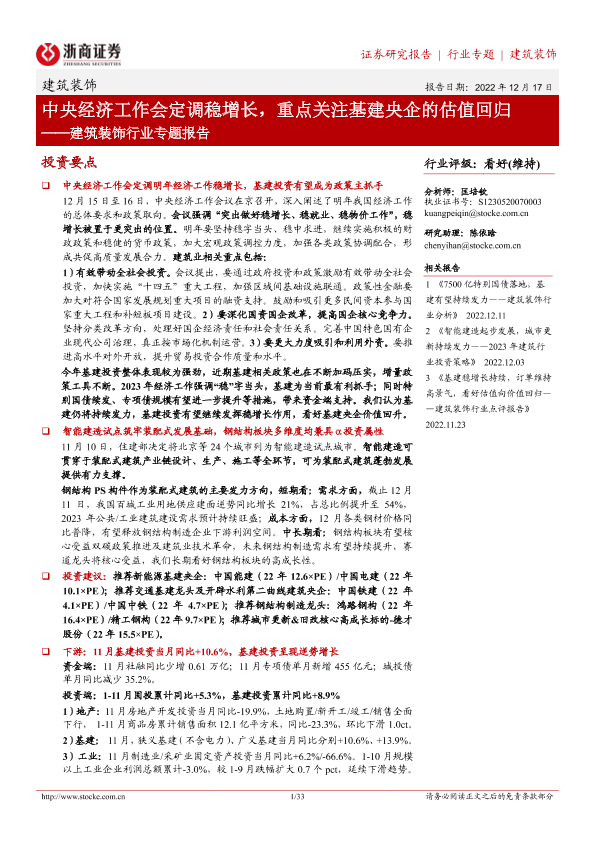 【浙商证券】【20221217】建筑装饰行业专题报告:中央经济工作会定调稳增长,重点关注基建央企的估值回归-33页