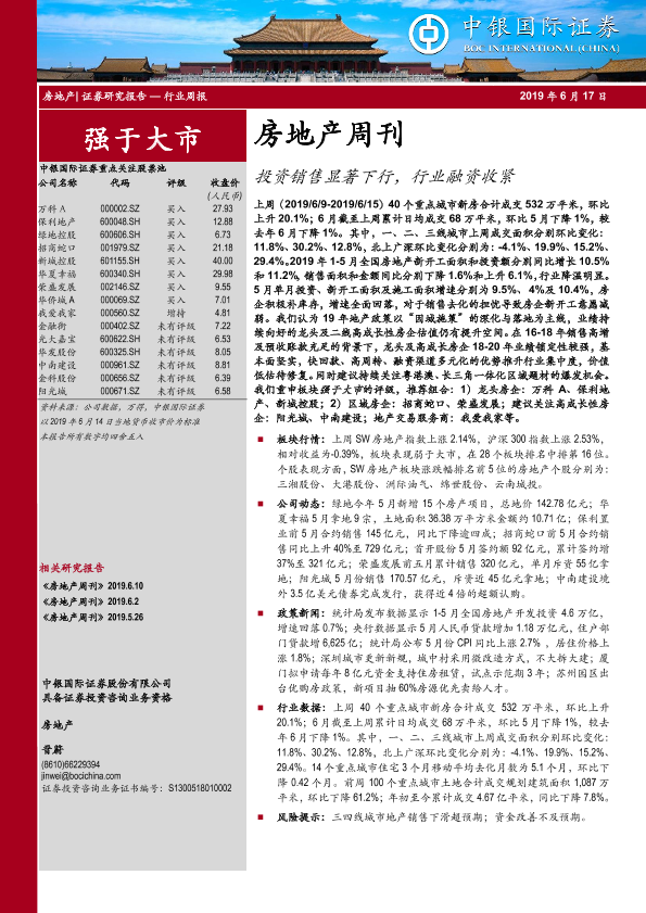 【中银证券】【20190617】房地产周刊:投资销售显著下行,行业融资收紧-18页