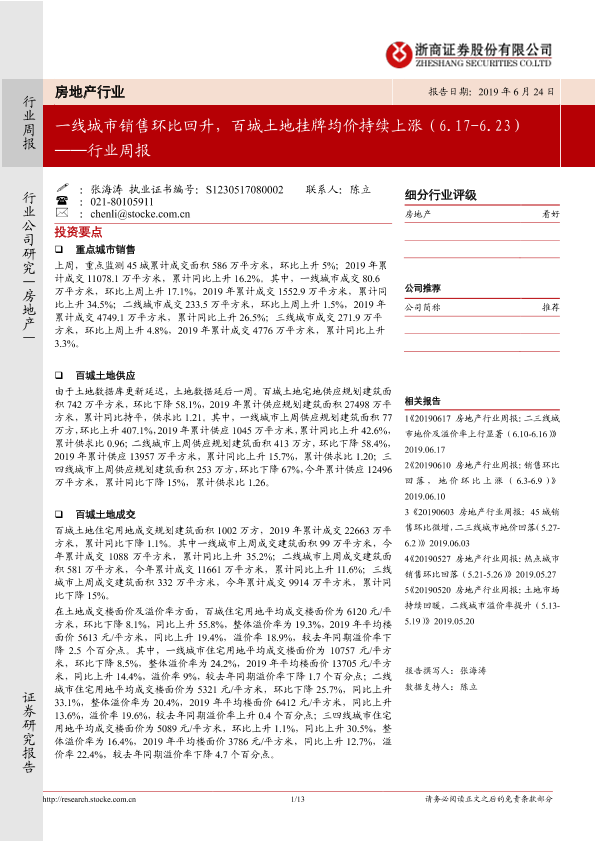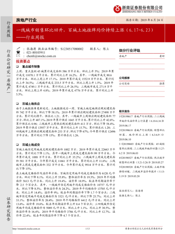 【浙商证券】【20190624】房地产行业周报:一线城市销售环比回升,百城土地挂牌均价持续上涨-13页