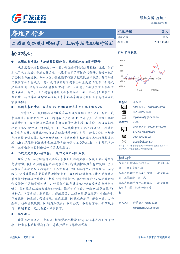 【广发证券】【20190630】房地产行业跟踪分析:二线成交热度小幅回落,土地市场依旧相对活跃-19页