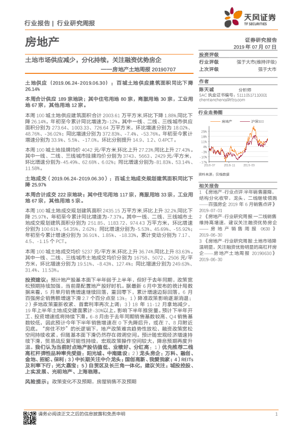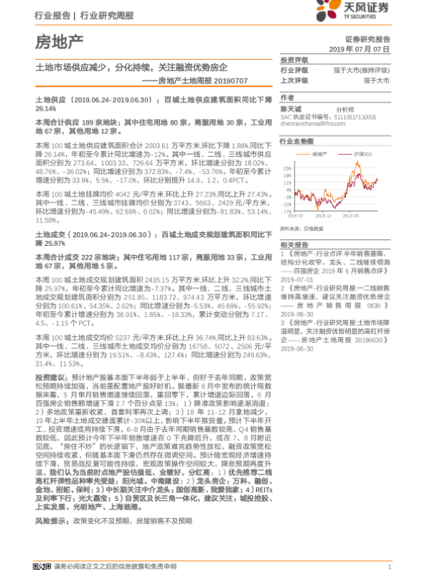 【天风证券】【20190707】土地市场供应减少,分化持续,关注融资优势房企-9页