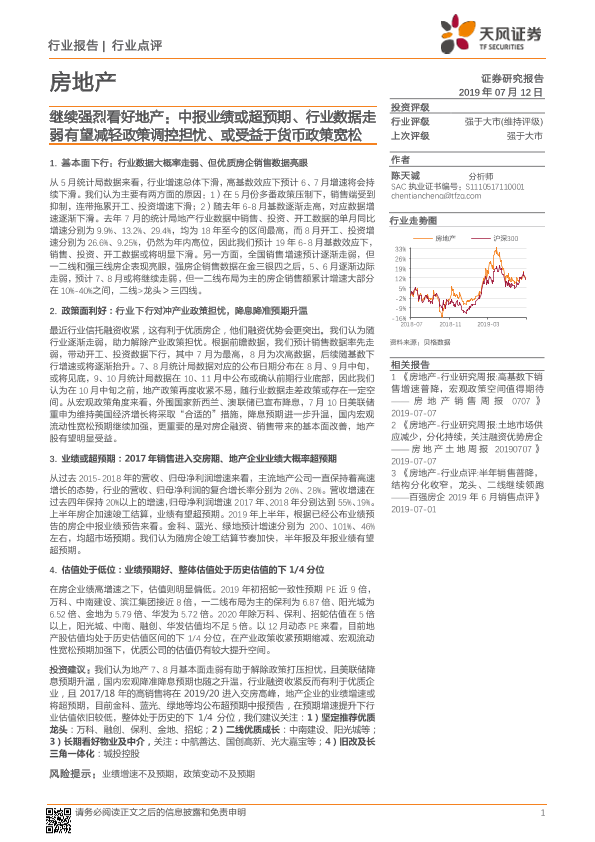 【天风证券】【20190712】继续强烈看好地产:中报业绩或超预期、行业数据走弱有望减轻政策调控担忧、或受益于货币政策宽松-6页