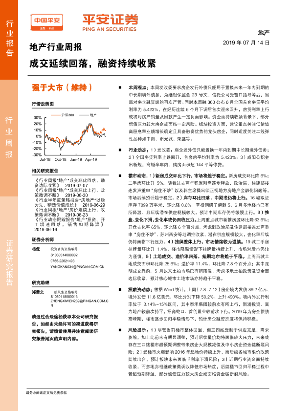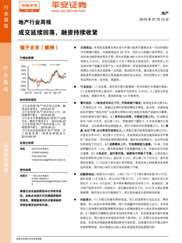 【平安证券】【20190714】地产行业周报:成交延续回落,融资持续收紧-6页