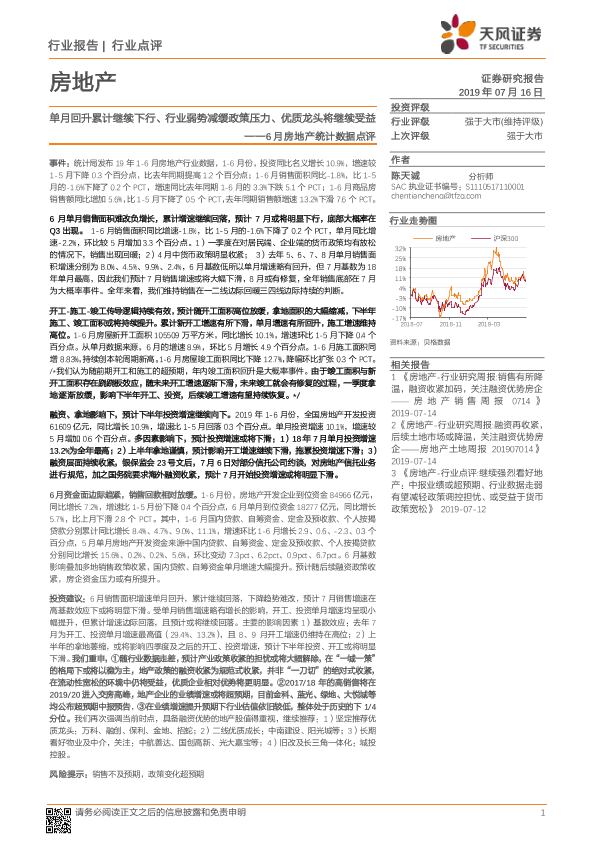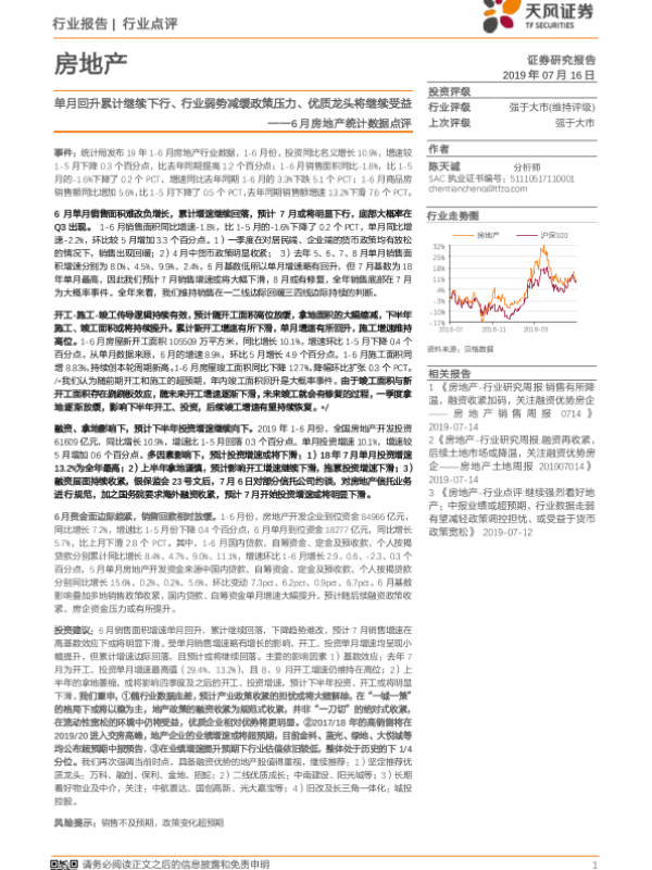 【天风证券】【20190716】6月房地产统计数据点评:单月回升累计继续下行、行业弱势减缓政策压力、优质龙头将继续受益-8页