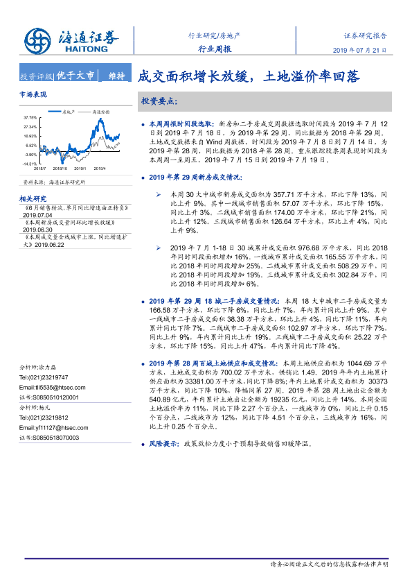 【海通证券】【20190721】房地产行业周报:成交面积增长放缓,土地溢价率回落-6页
