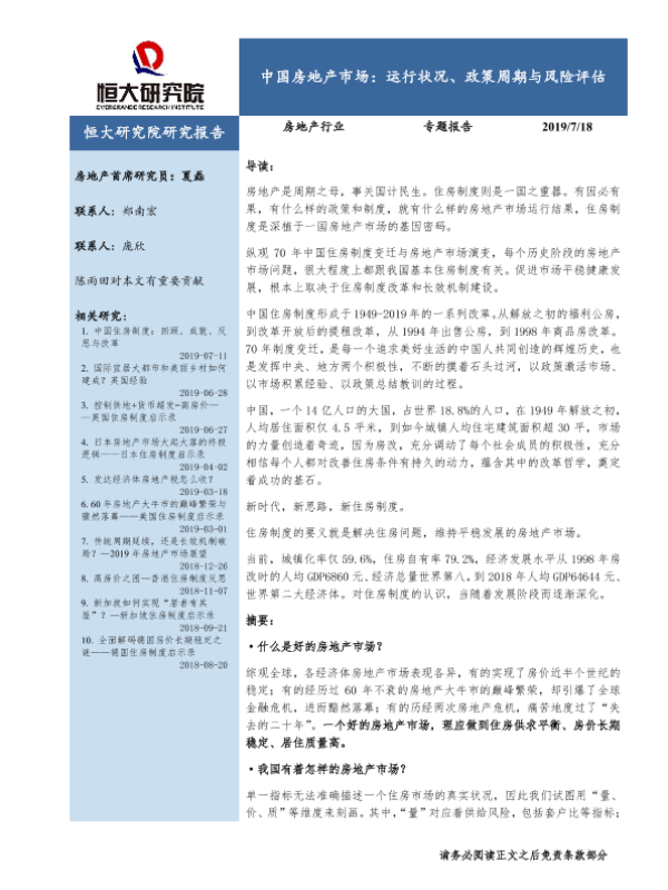 【恒大研究院】【20190718】中国房地产市场:运行状况、政策周期与风险评估-33页