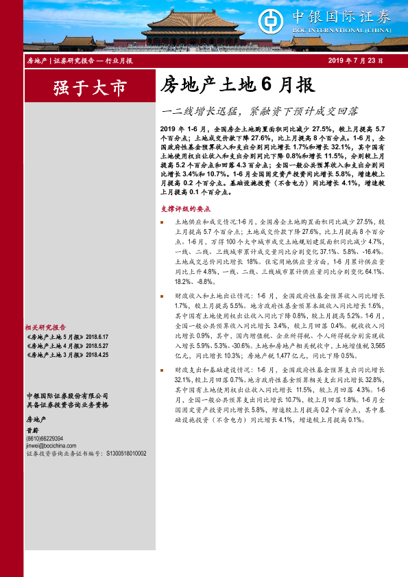 【中银证券】【20190723】房地产土地6月报:一二线增长迅猛,紧融资下预计成交回落-13页