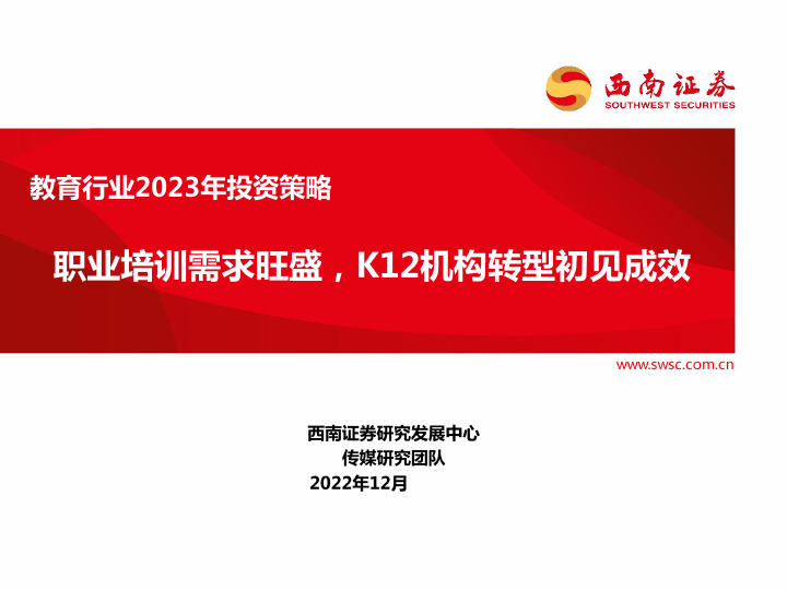 【西南证券】【20221220】教育行业2023年投资策略:职业培训需求旺盛,K12机构转型初见成效-30页