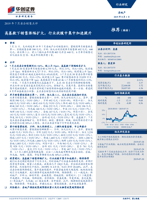 【华创证券】【20190801】2019年7月房企销售点评:高基数下销售涨幅扩大,行业放缓中集中加速提升-11页